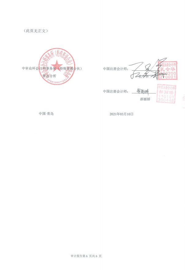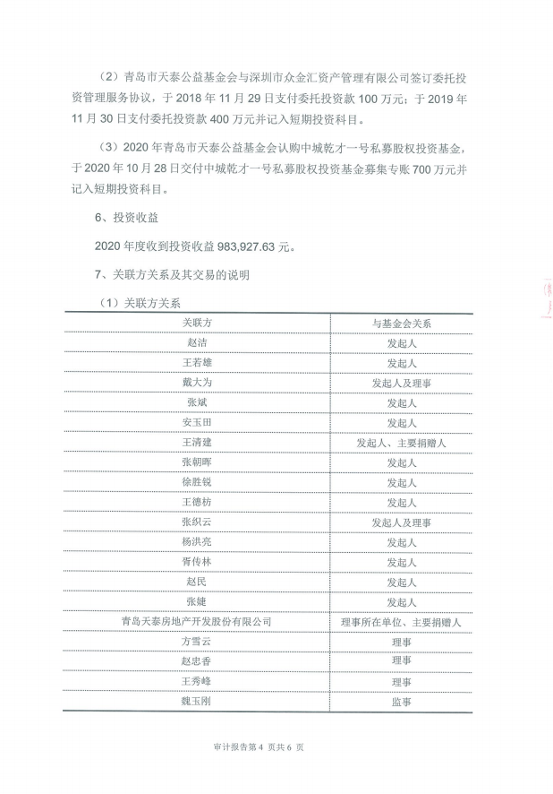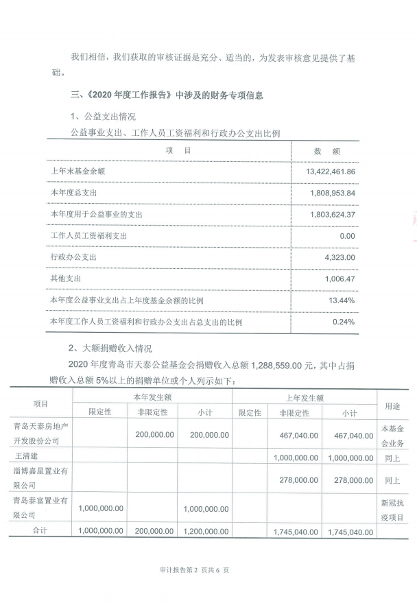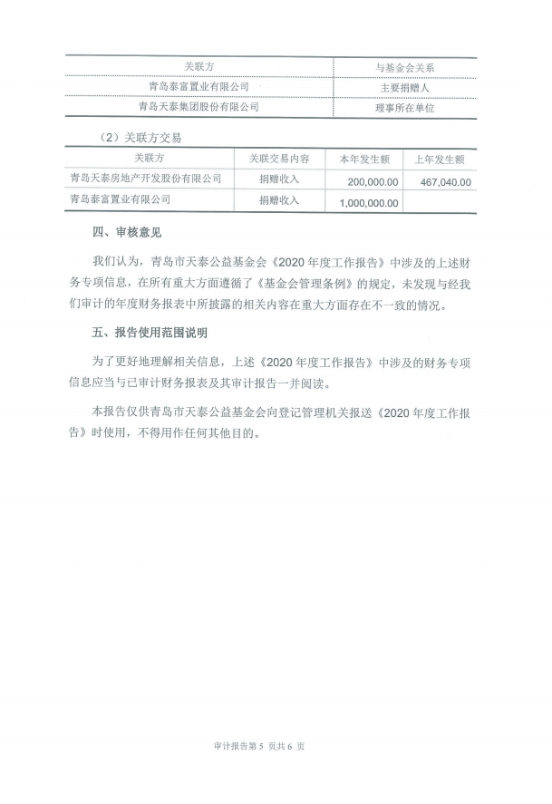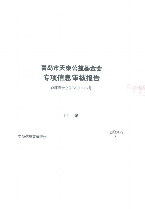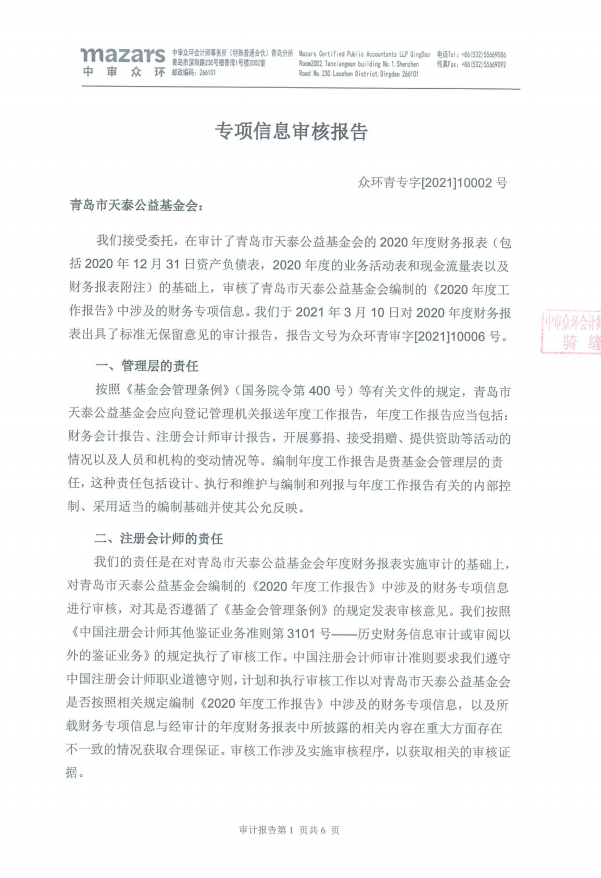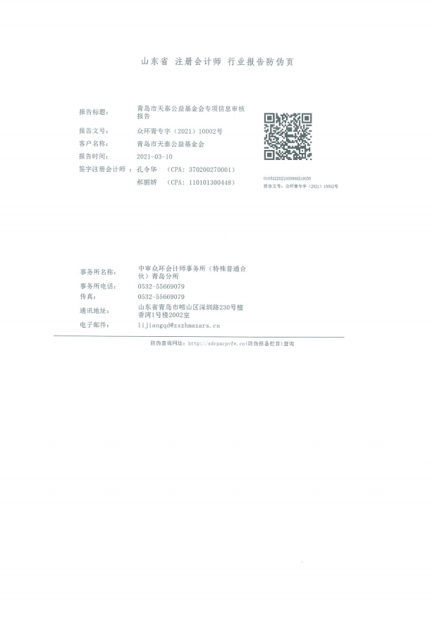 青岛市天泰公益基金会2020年度专项信息审核报告