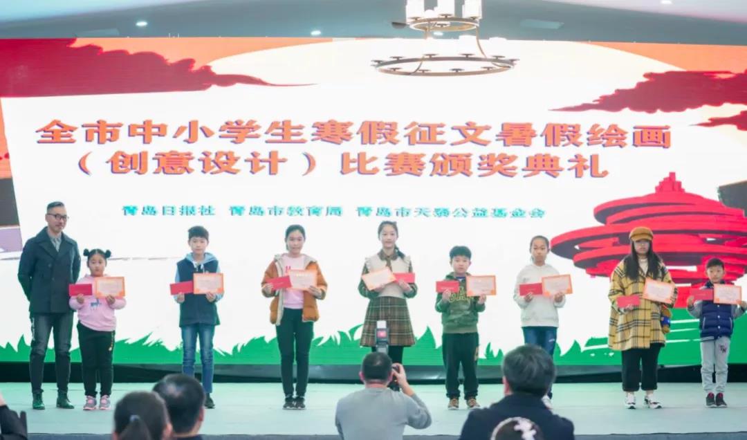 12月12日,由天泰公益基金会资助、青岛日报社、青岛市教育局联合主办的全市中小学生寒假征文和暑假绘画(创意设计)比赛两个项目颁奖典礼在LOVEYE天泰山艺...