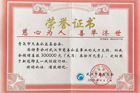 2020年1月28日,面对武汉严重的疫情状况,由天泰员工等爱心人士捐助的1002笔善款,经由天泰公益基金会配资,共计30万元善款及时捐给了武汉市慈善总会,助力抗击新冠病毒。