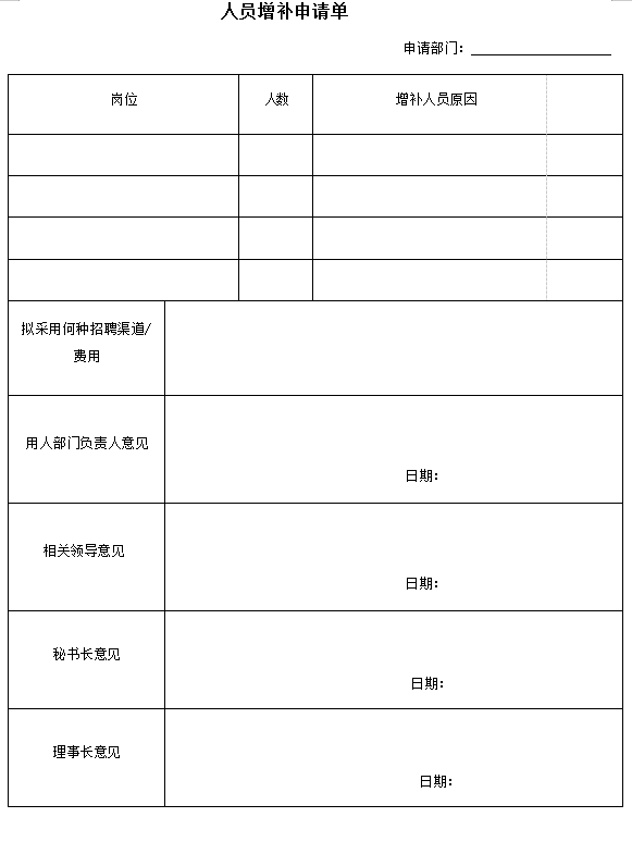 4.1.1基金会需要增加工作人员,由人力资源处填写《人员增补申请单》且附《岗位说明书》报理事会相关人员参与意见,经理事长批准后组织招聘。