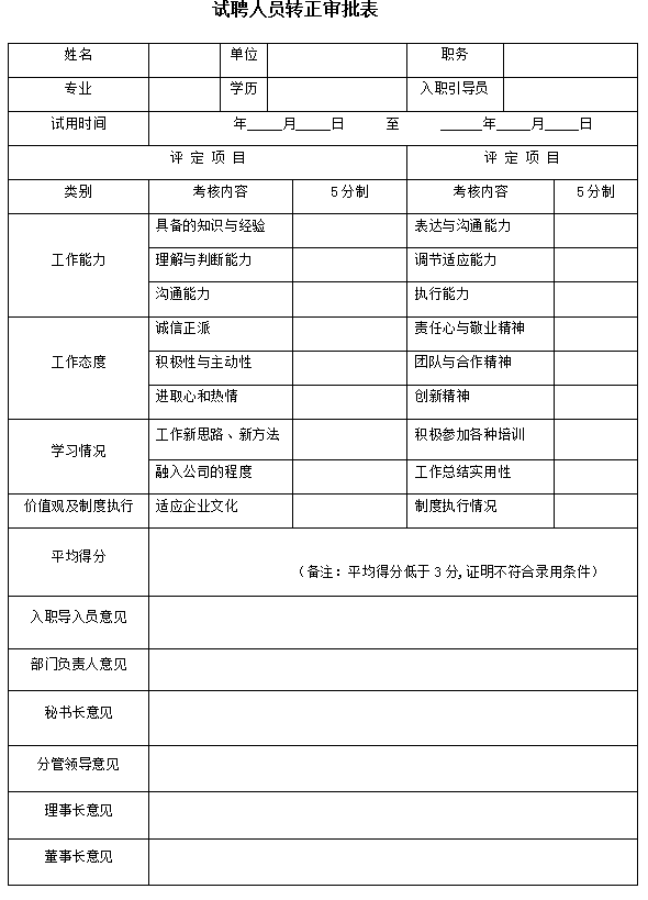 4.2.3试聘期届满,由人力资源处组织对其考核。考核不合格者,由人力资源处提出继续任用的建议,报理事长批准后,与其办理解除劳动合同;考核合格的,人力资源处填写《试聘人员转正审批表》,按照工作权限审批。