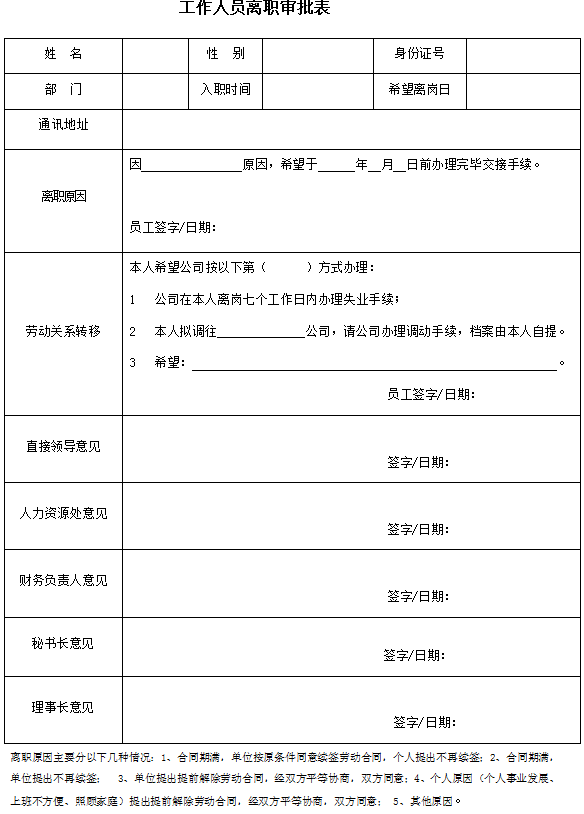 拟离职人员填写《基金会工作人员离职审批表》,经直接领导、人力资源处、财务负责人、秘书长、理事长等审批。