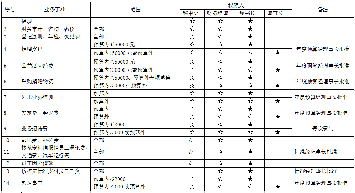 6、 本权限表中☆代表审核,★代表批准。
